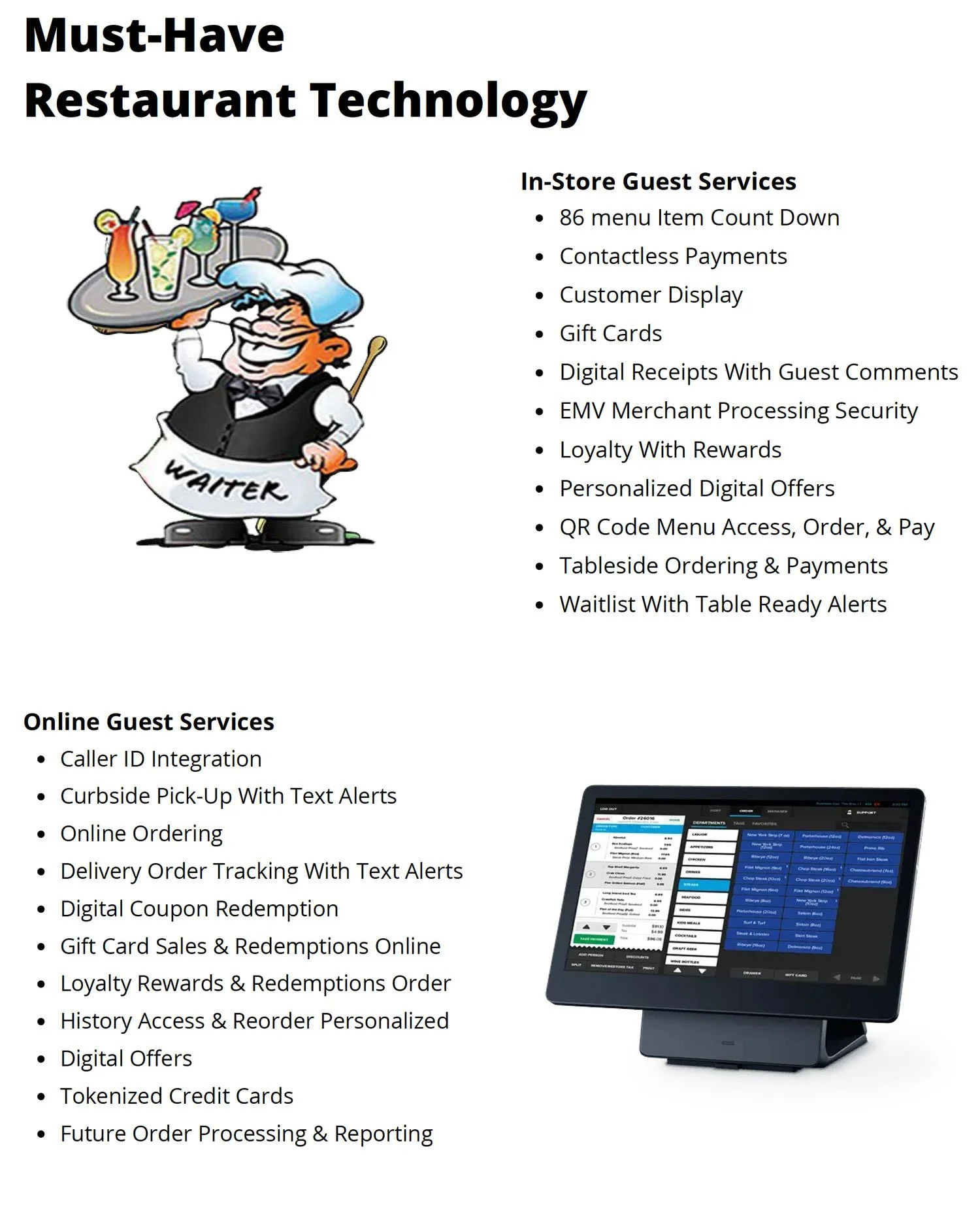 Your staff and patrons deserve a POS system that is customizable to adapt to the most recent trends in table service. Help reduce ordering time by merging all menu options onto one screen. Ask about our POS equipment and tablet offerings.