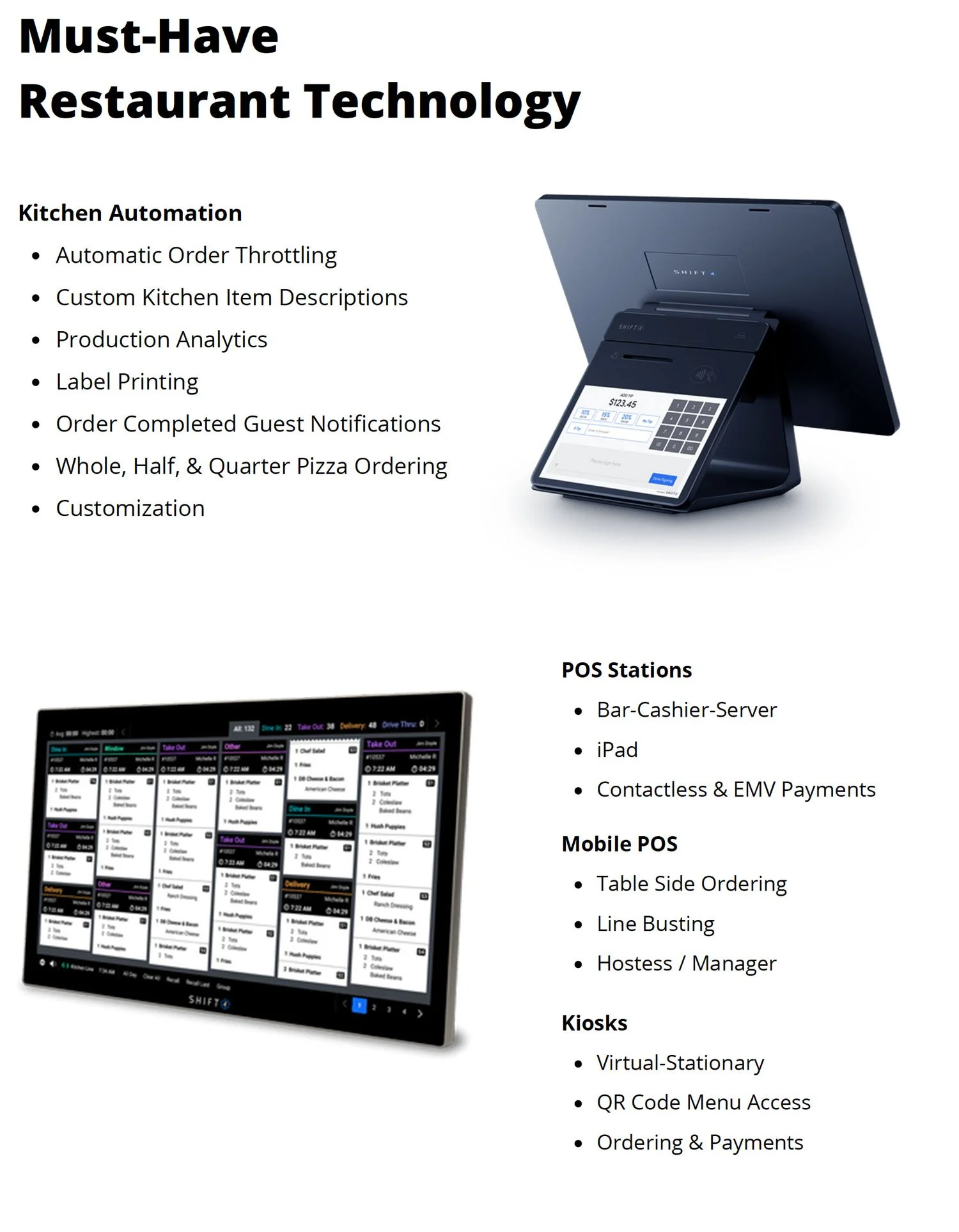 Every system comes with a 16” touch screen, card reader, router, cash drawer, receipt, kitchen printers and surge protector.